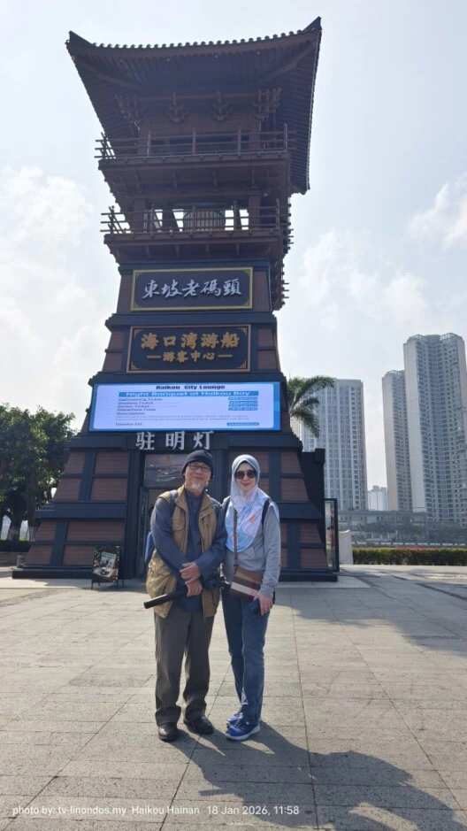 Pada 18 Januari 2026 lalu, kami abadikan sebuah gambar di hadapan Menara Deng Ming Deng di Haikou, Hainan. Struktur kayu bergaya tradisional Cina ini menampilkan ukiran halus dan bumbung melengkung, serta berfungsi sebagai tarikan budaya dengan penyalaan lampu khas antara jam 18:15 hingga 19:15.